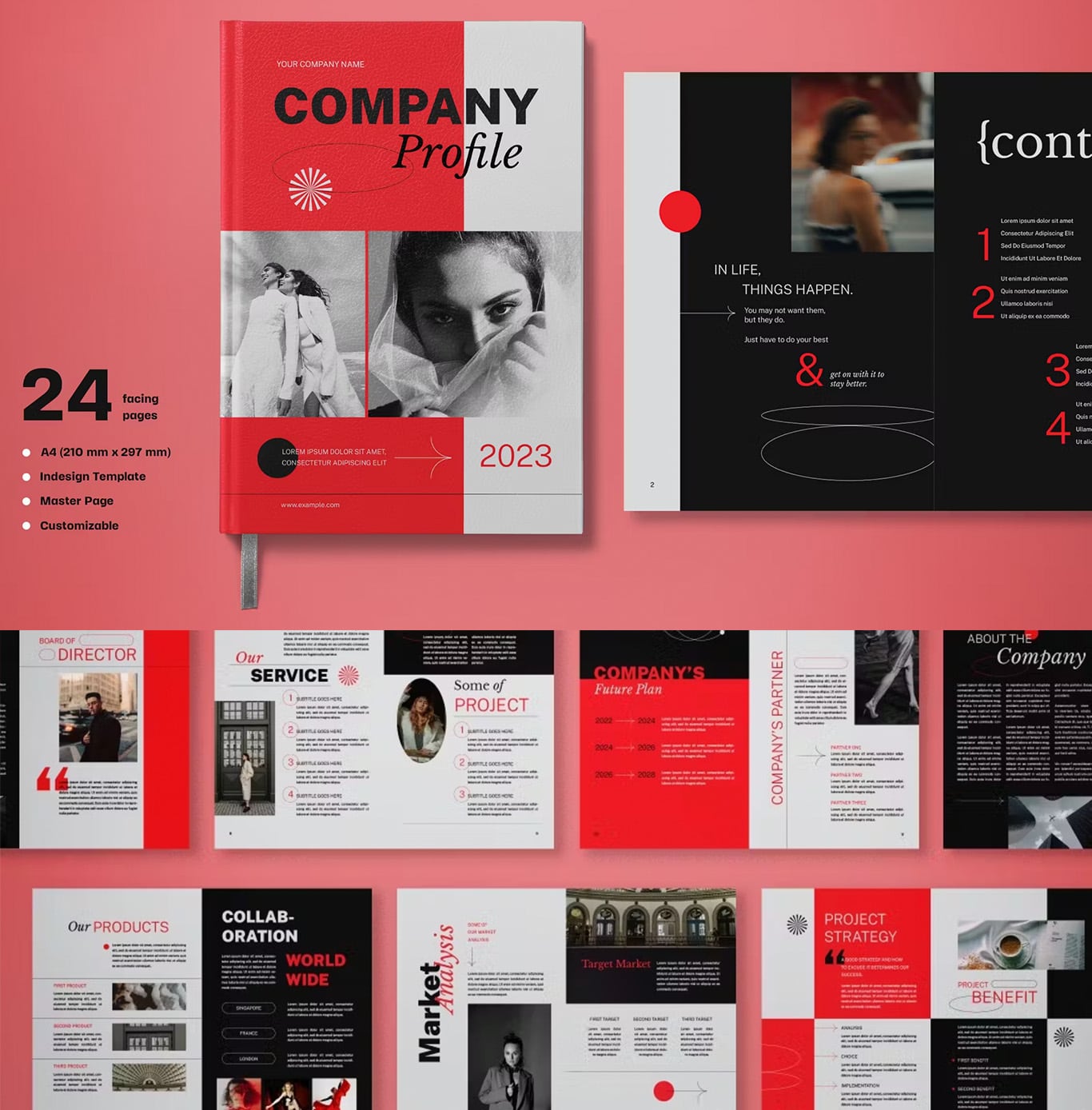 Make a statement with this bold red company profile book. Ideal for showcasing your business vision.