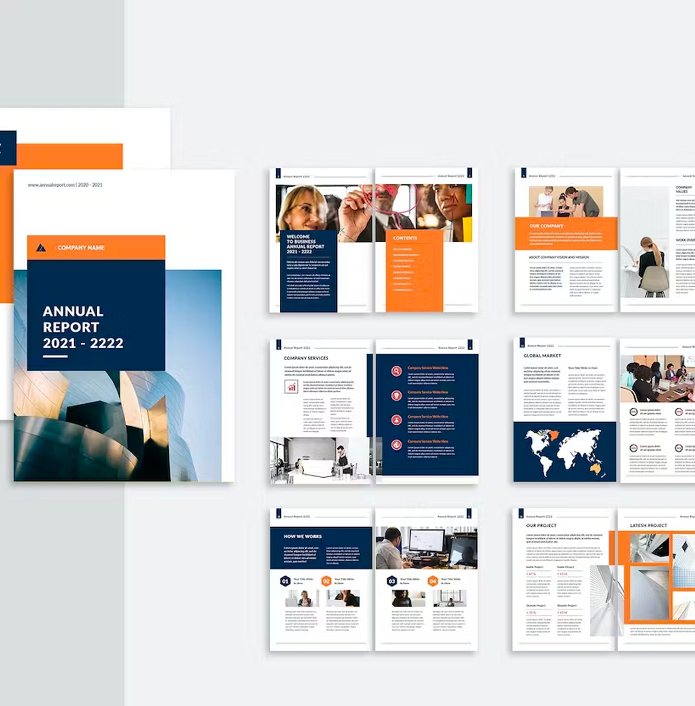 Visualize your statistics with this annual report template, employing engaging blue and orange graphics.