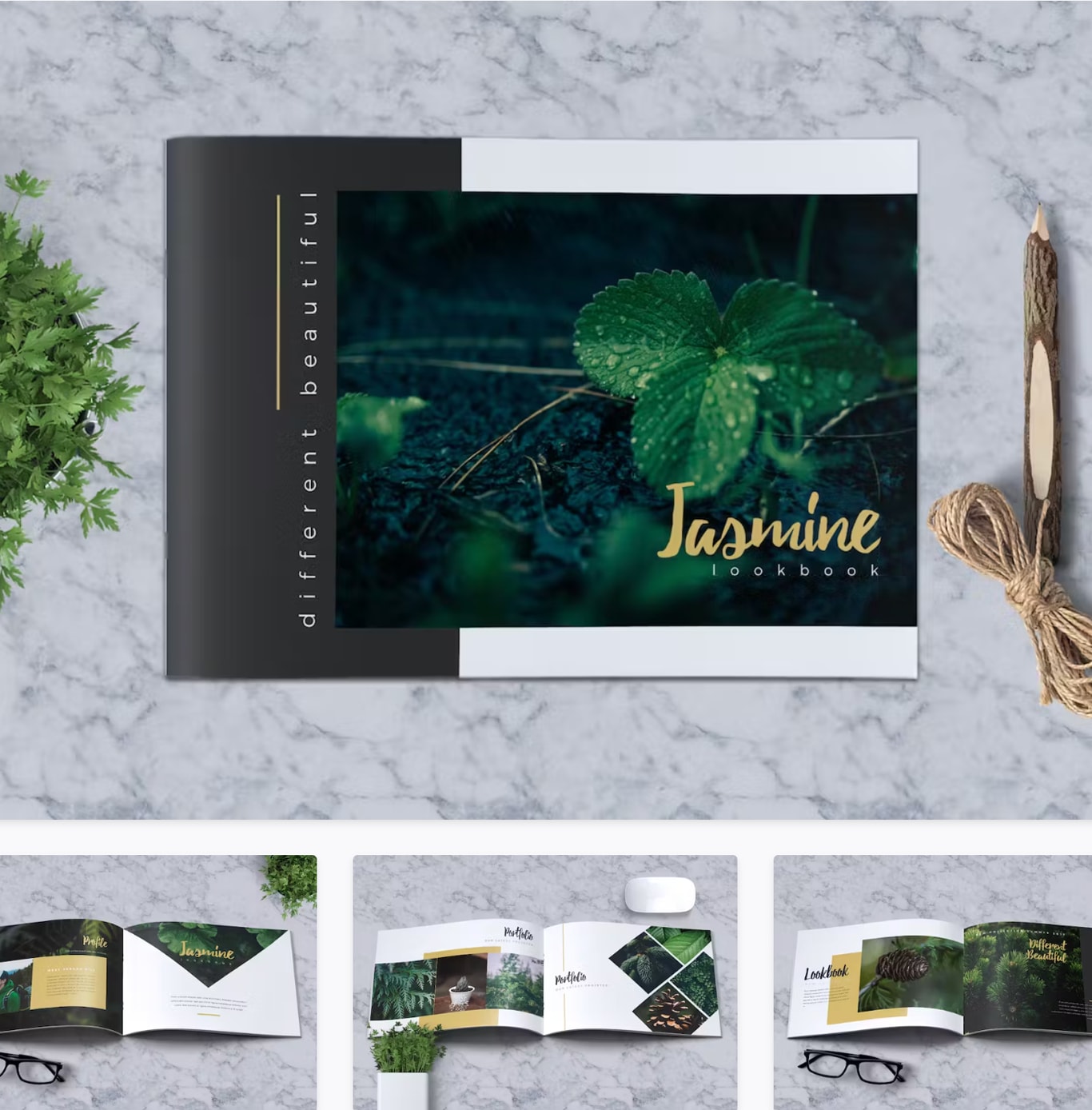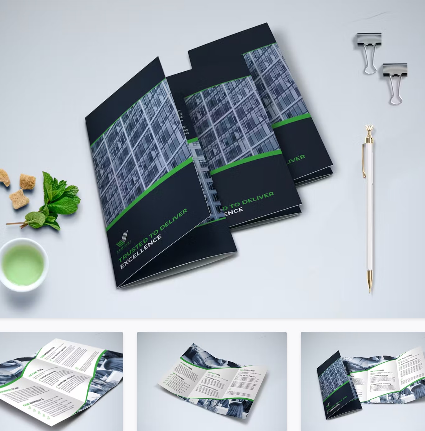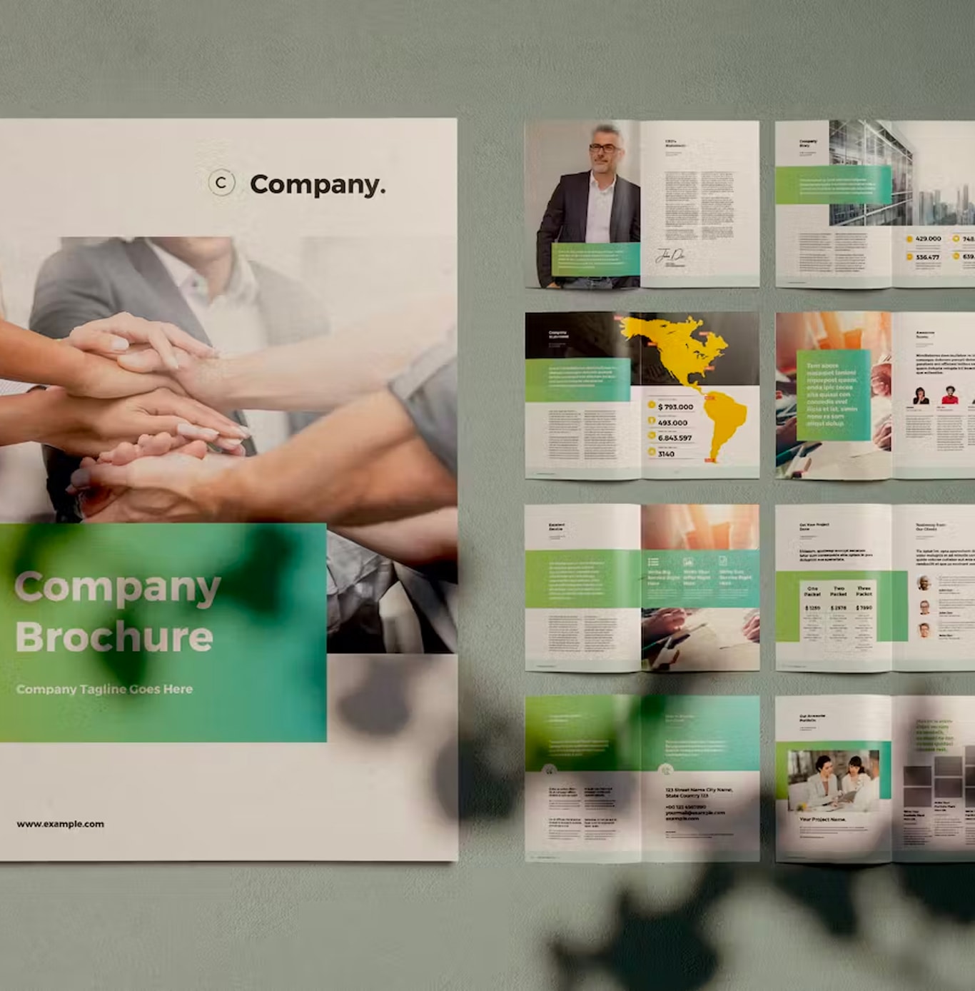Green design for a company brochure. It’s practical and elegant, with high-quality designs and drawings. It has enough space for photos and company info.