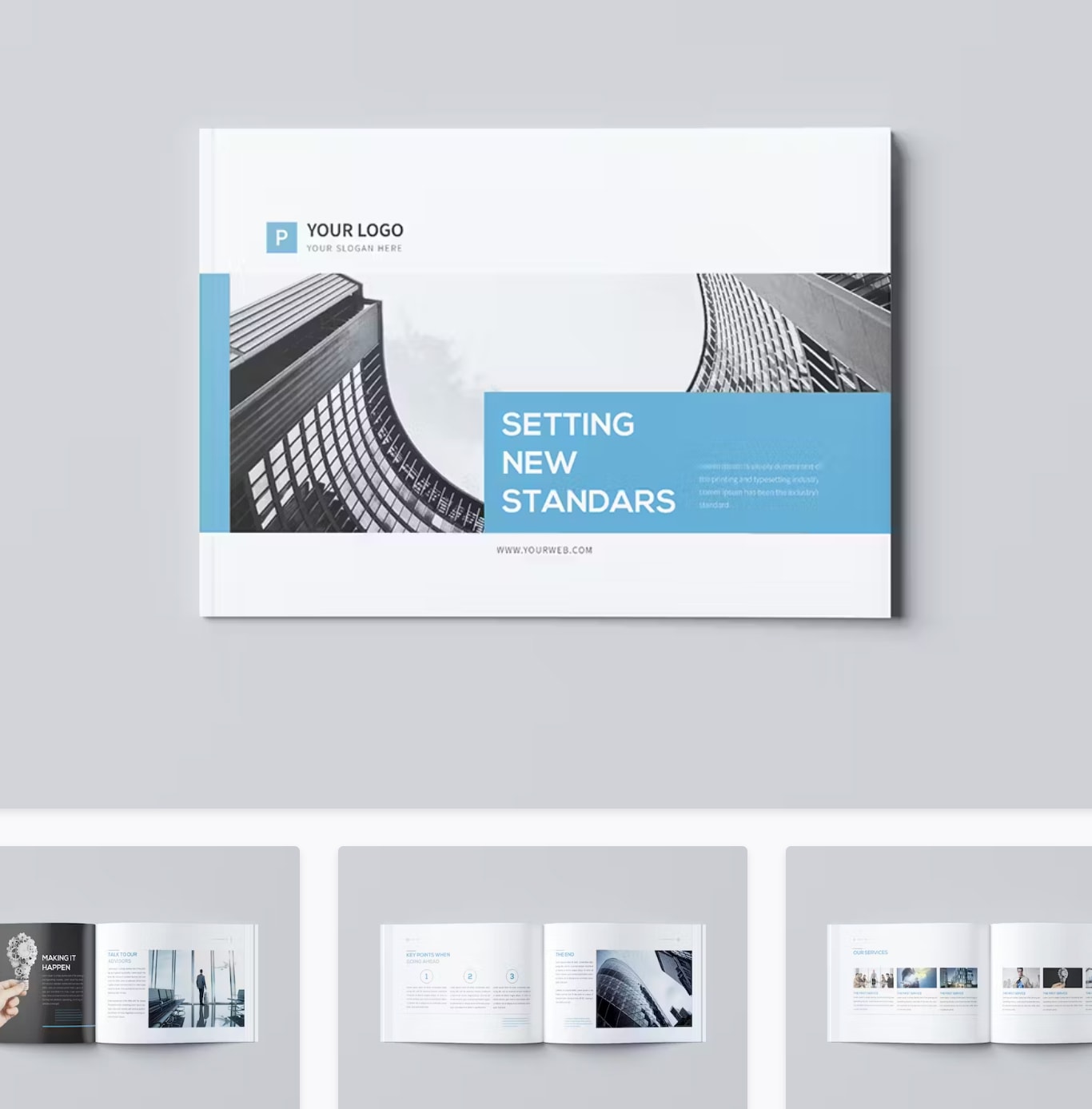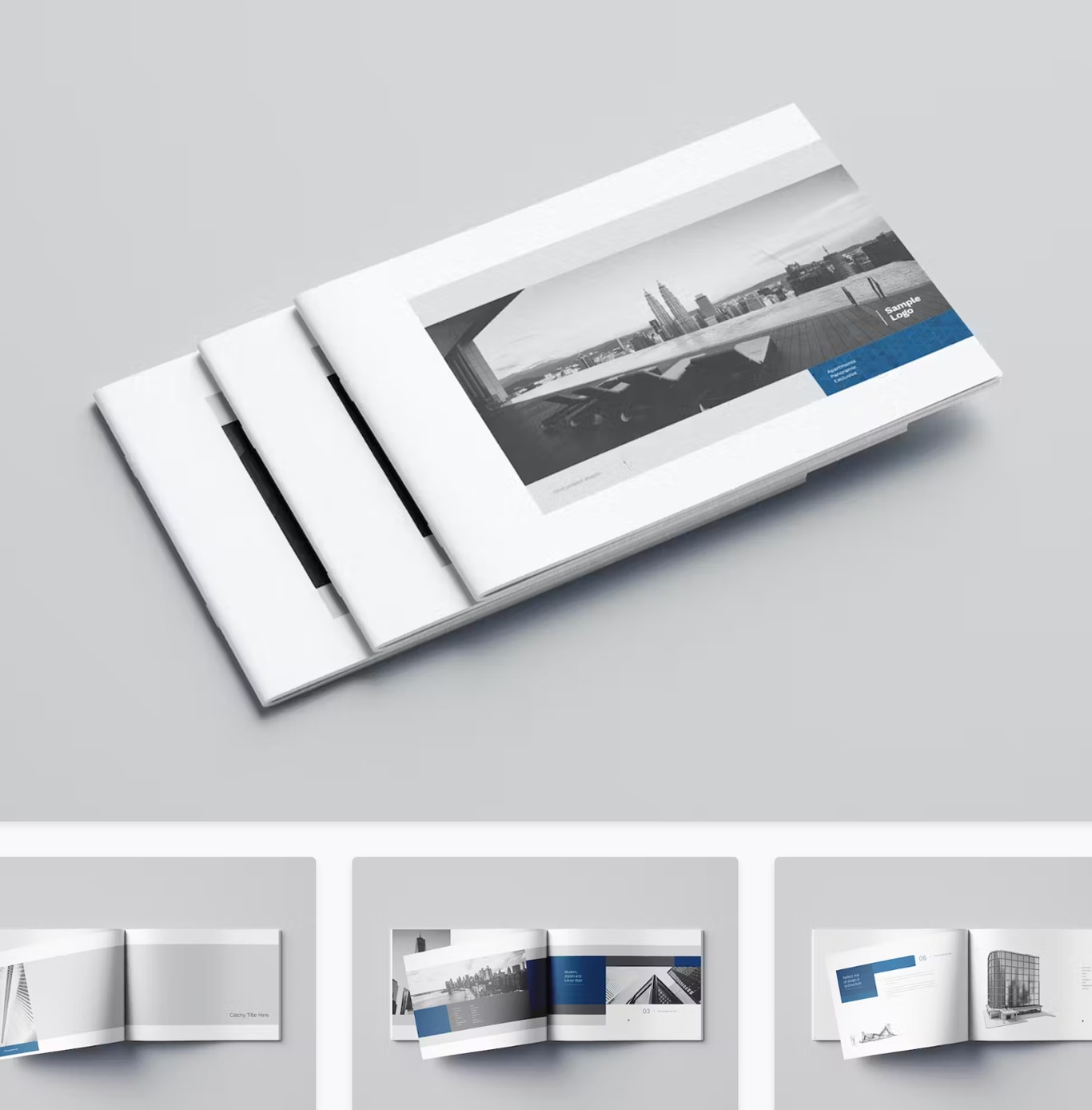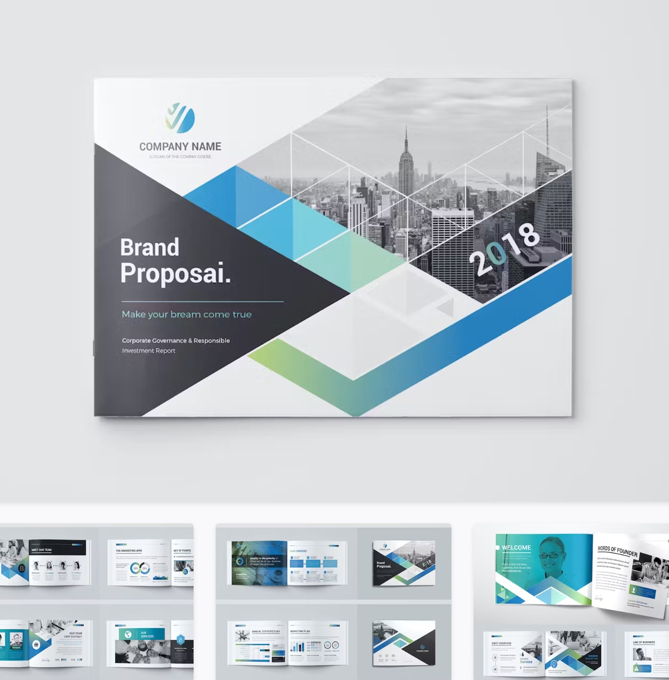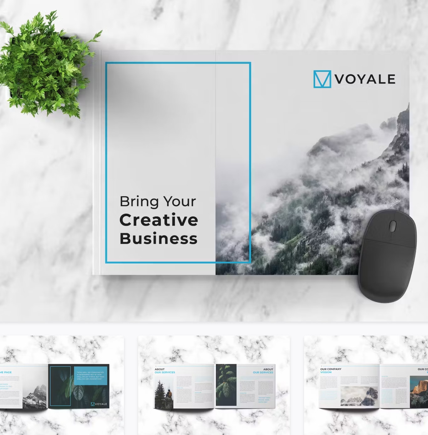 Bring your company's ideals and ideas to life with this original brochure template. The landscape orientation in combination with the landscape details and teal “pops” of color make this template sophisticated, high-class, and suitable for every corporation.