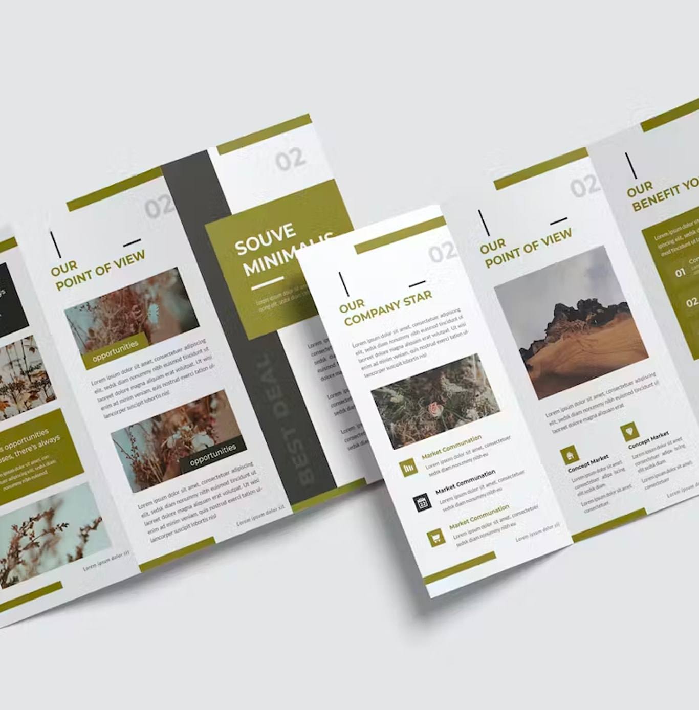 Simple trifold brochure template with a green and white design. Excellent for furniture brochures or interior design. It's practical and very commonly used.