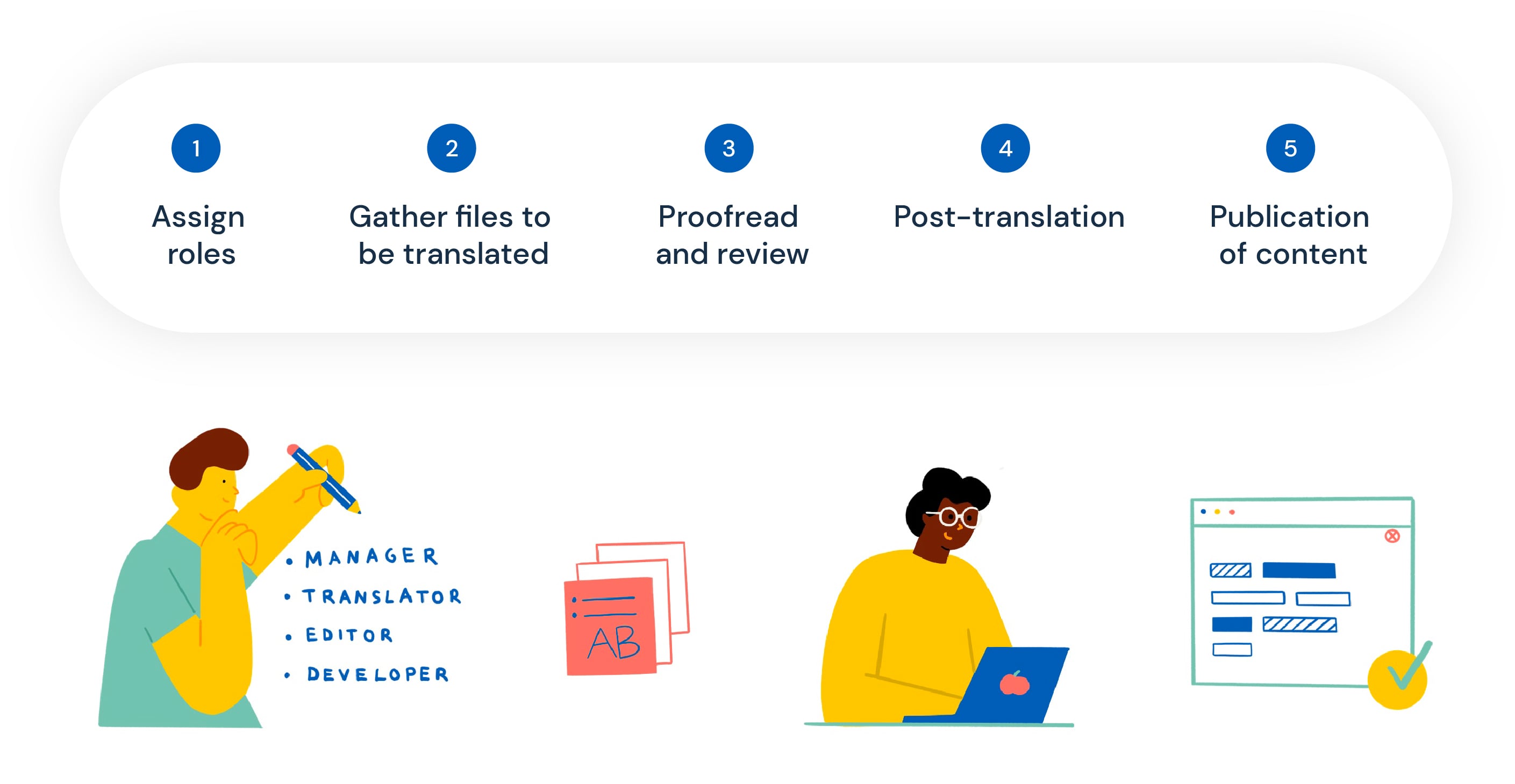- Post-translation: Once a translation has been approved for publication, the design team will work on preparing the material for publication. At this stage, the translations should be compatible with the specifics of the design, which is why it is a must to to include inputs from the localization team.