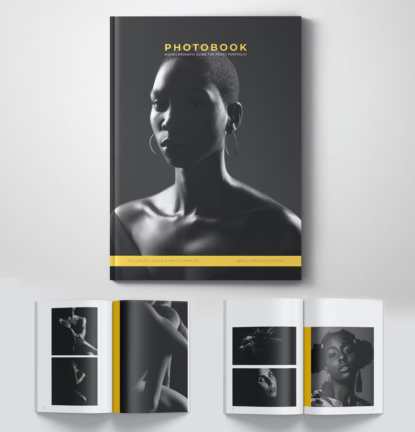 Beautify your photographs through an elegant ensemble using this simple potrait template. The pages are accentuated with black strips and serif characters to volume up your photobook's aesthetic.