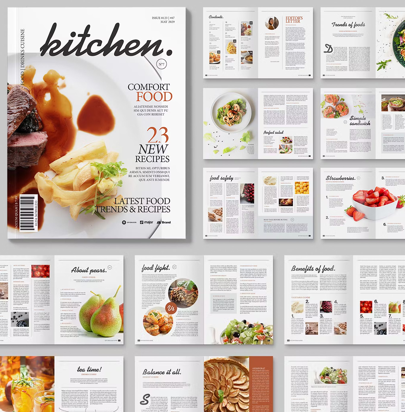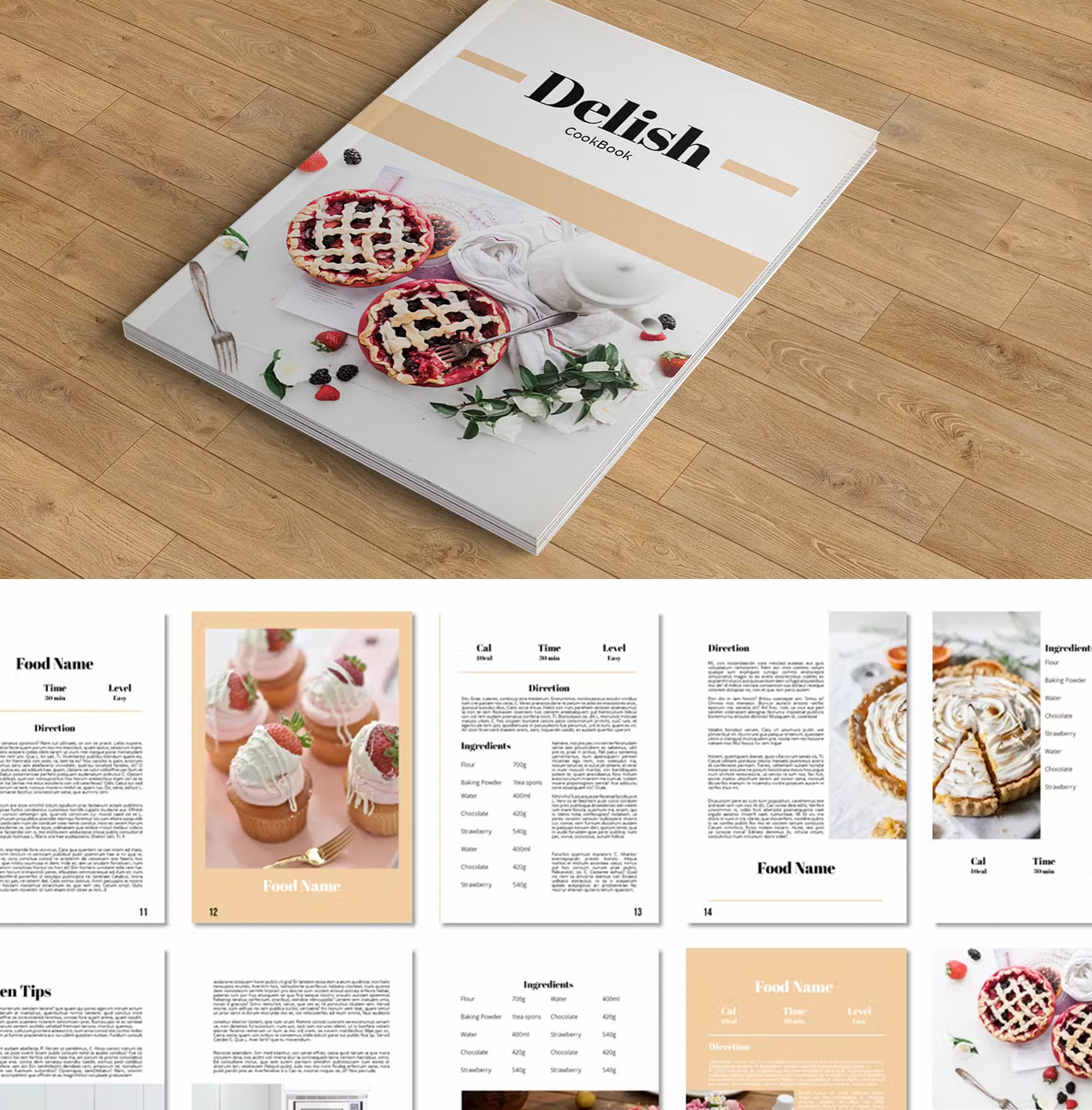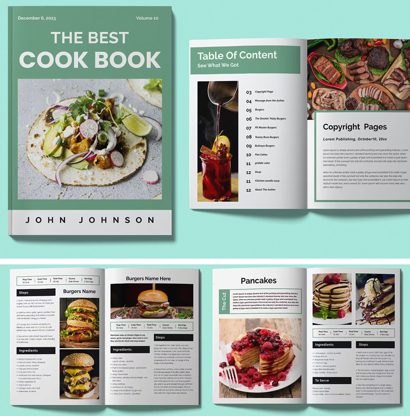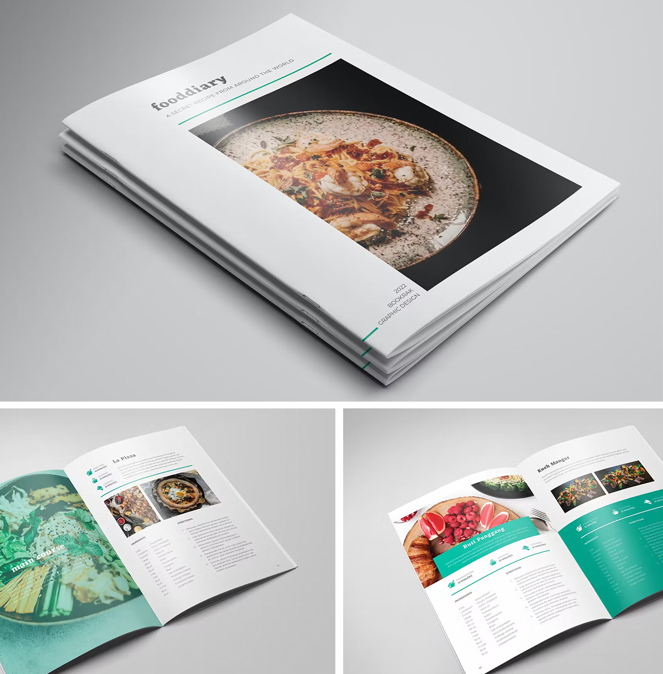 This well-organized, clean, professional cookbook template is ideal for ebooks, print magazines, or showcasing food photos with recipes.
