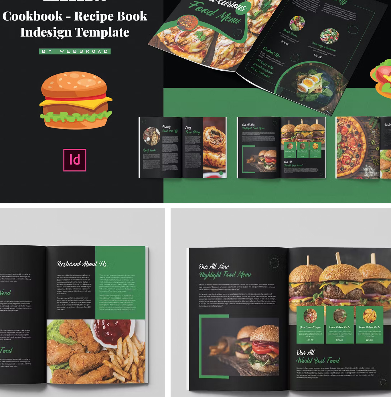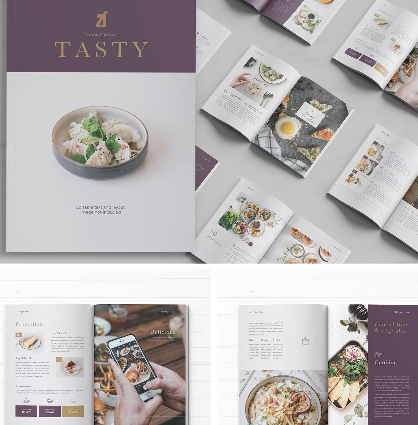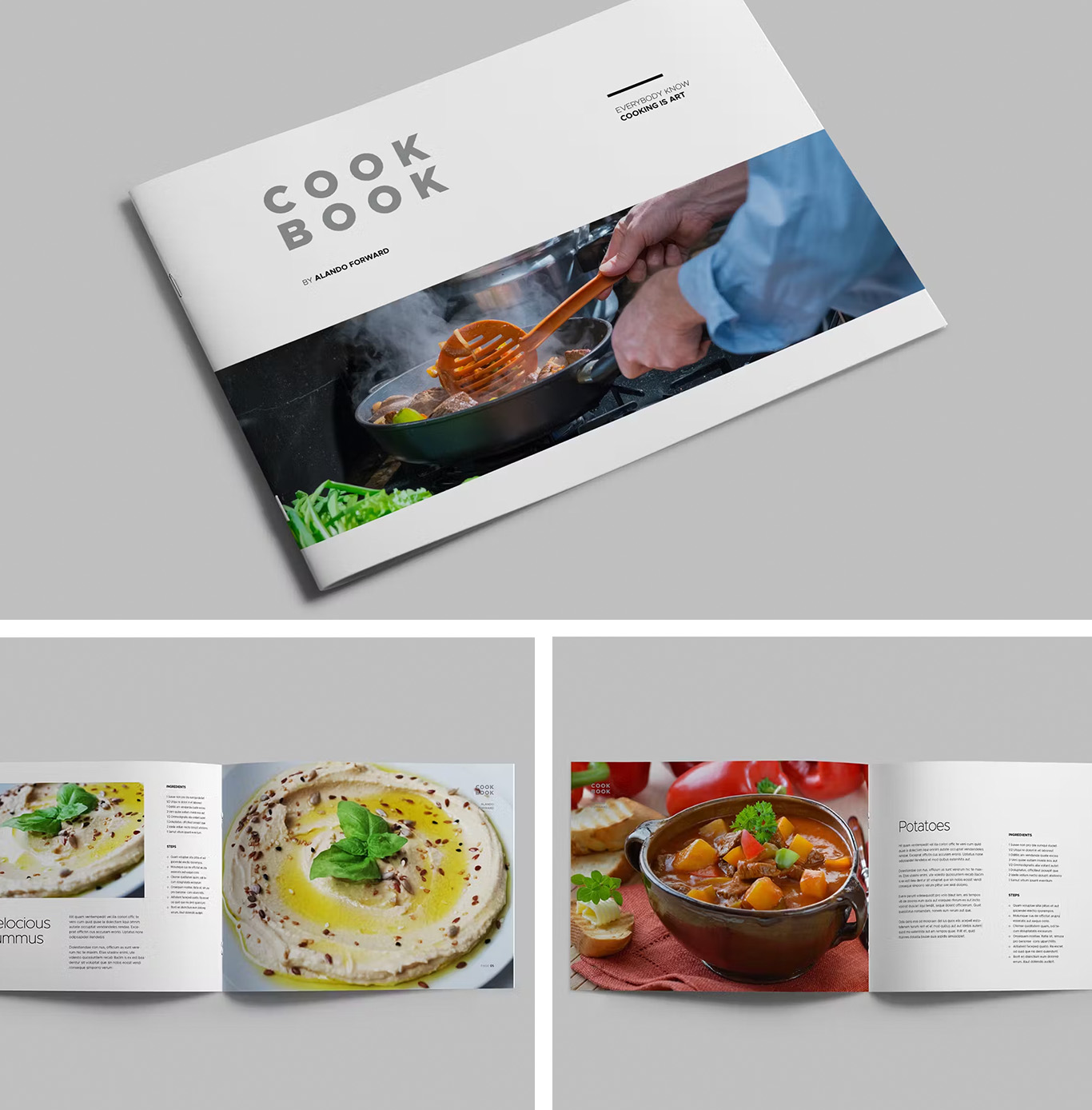 Bold typography, light backgrounds, and perfect picture placement; these are the key ingredients of this wonderful cookbook template. It has a well-structured layout and polished overall look.