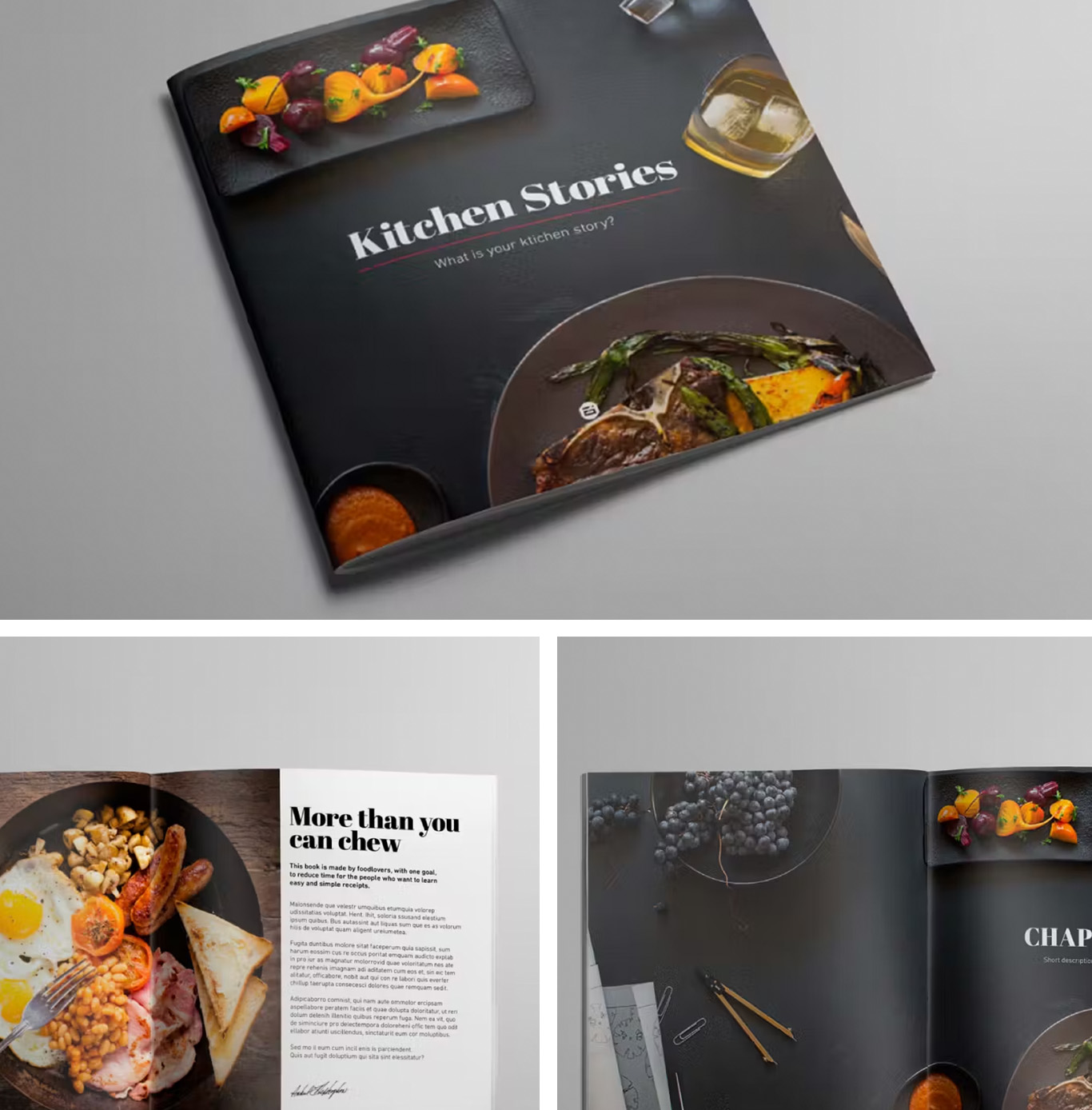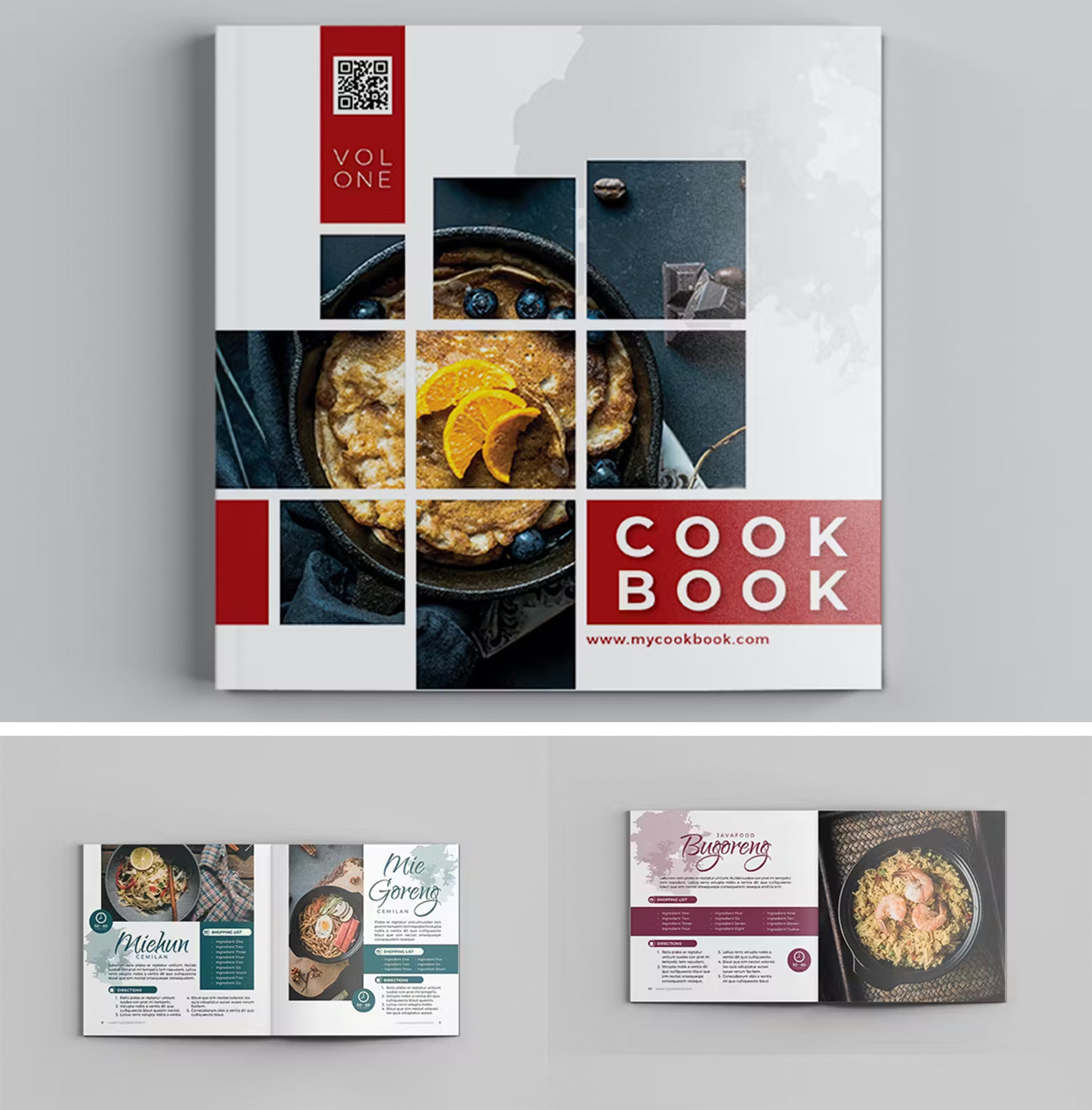 Bold and eye-catching, this cookbook template is perfect for portfolios, brochures, or catalogs. It features unique layouts with contemporary typography.