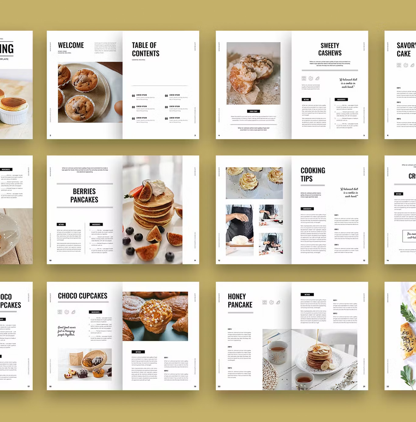 Each page in this cookbook template features unique layouts with contemporary typography. Its minimal and elegant design perfectly frames your recipes.