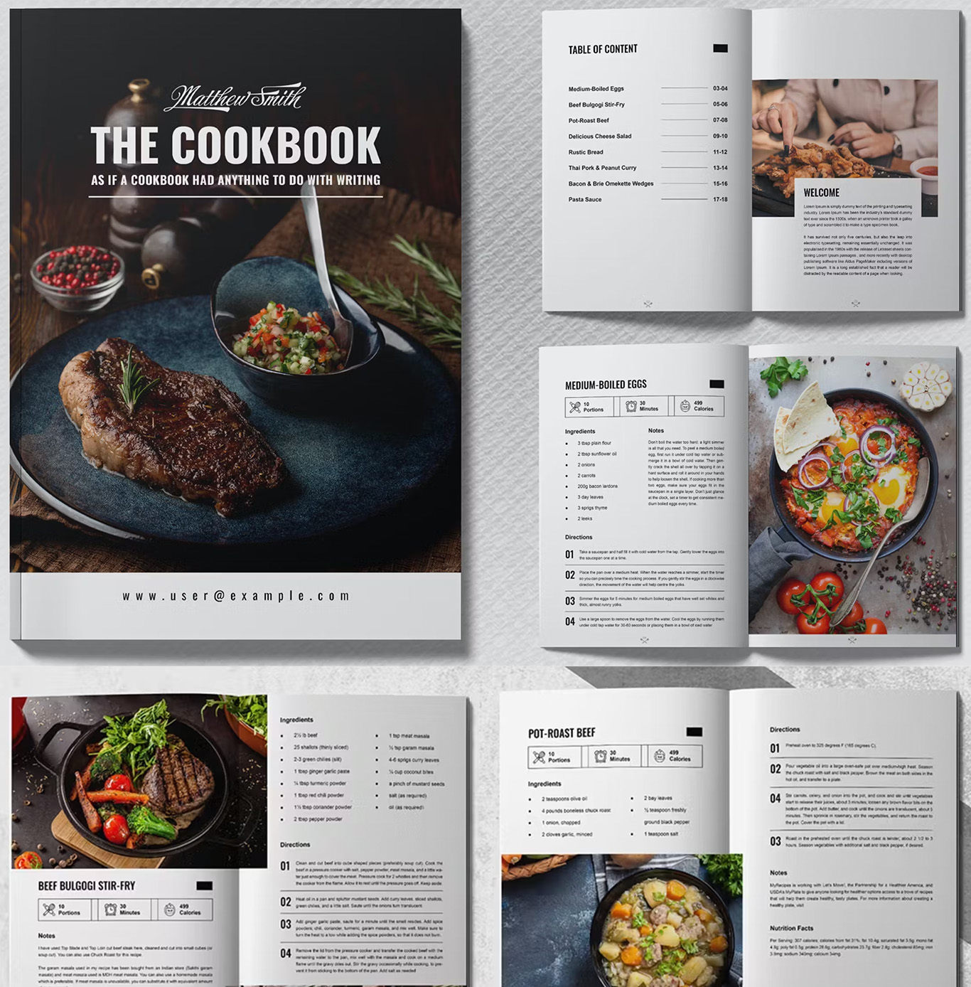 A perfect template for a complete, professional cookbook. Features a modern, clean design that's sure to appeal to any food lover.