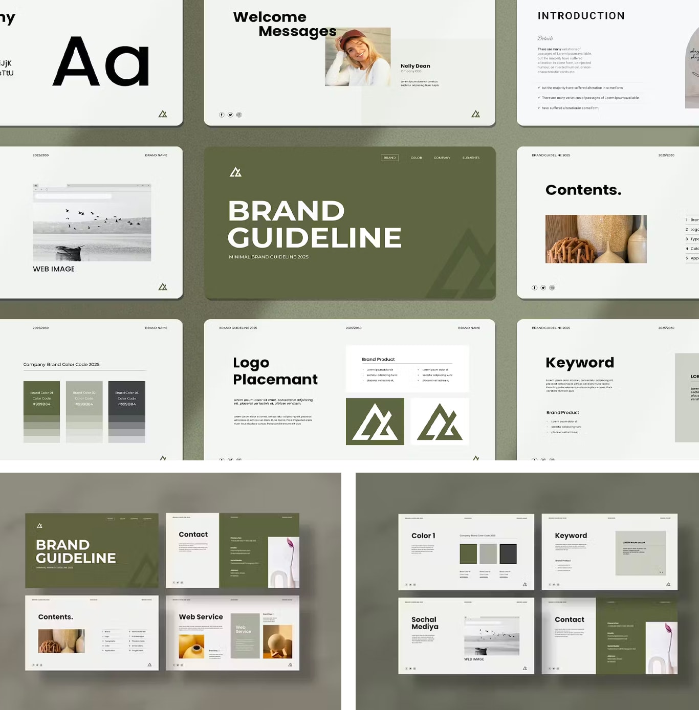 Discover elegance in muted green colors, evoking a sense of calm and serenity in this brand template. This portfolio template is an elegant and calming choice for those who want to create a sense of peace and tranquility. With its muted green colors and serene design, it's sure to create a relaxing atmosphere.
