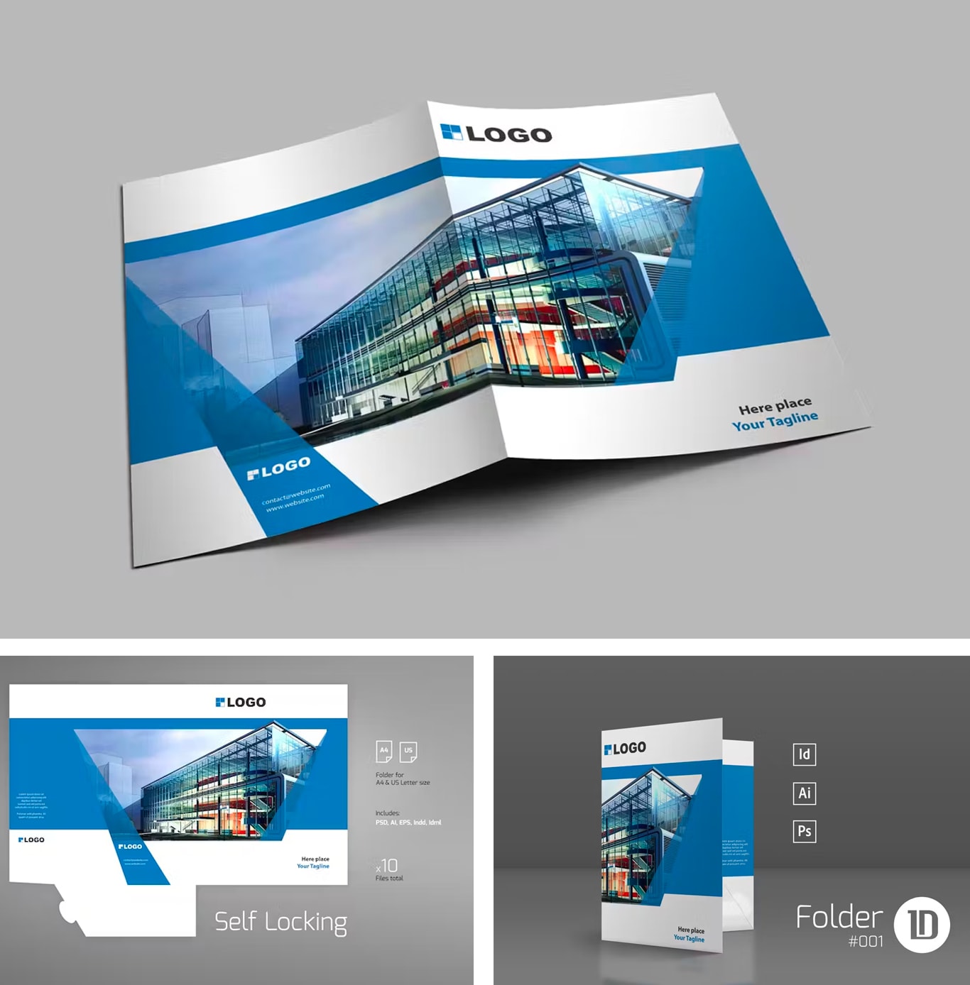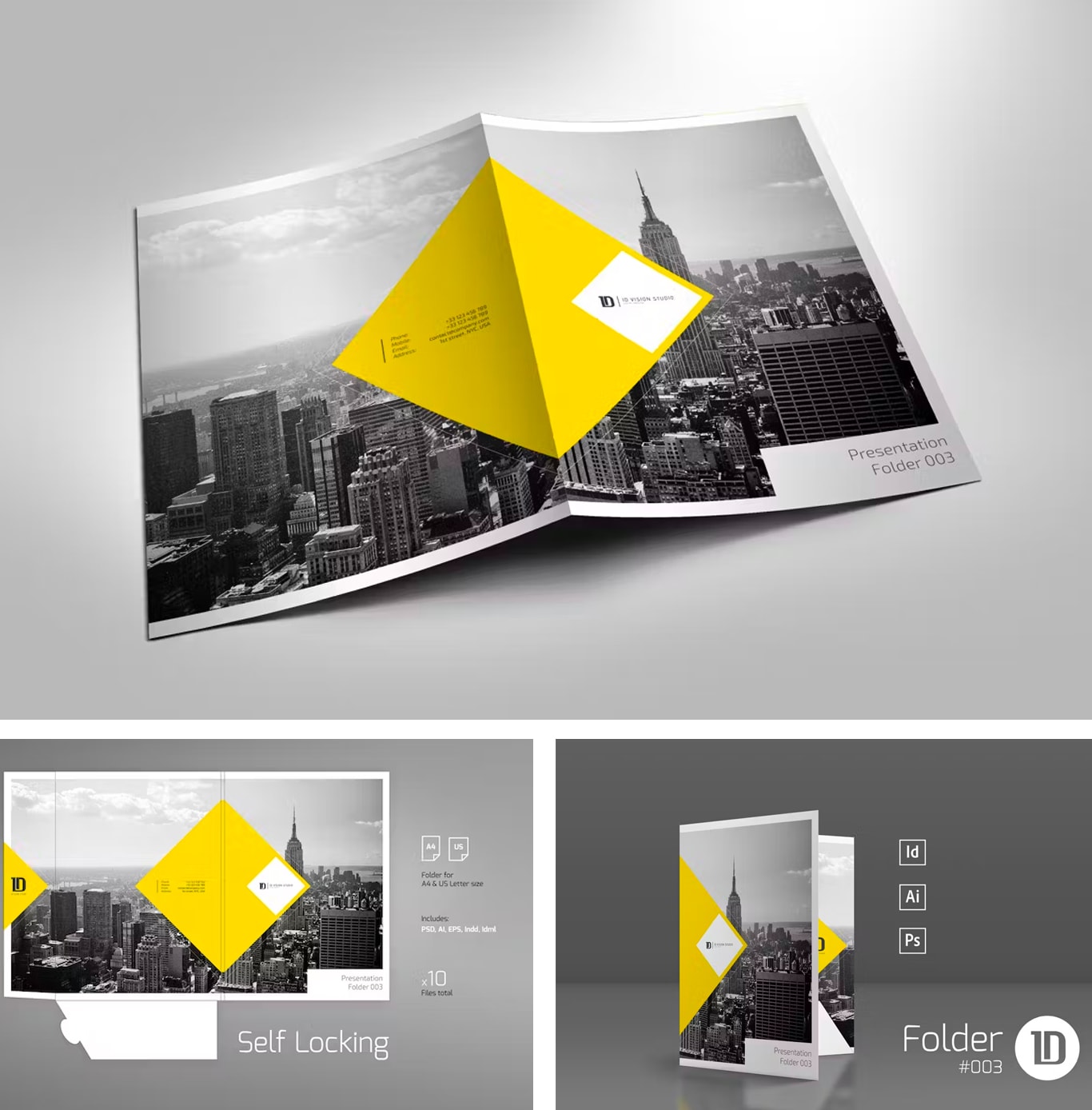 Make a bold statement with this sleek presentation folder template. Strong lines and a dark theme exude professionalism and style.