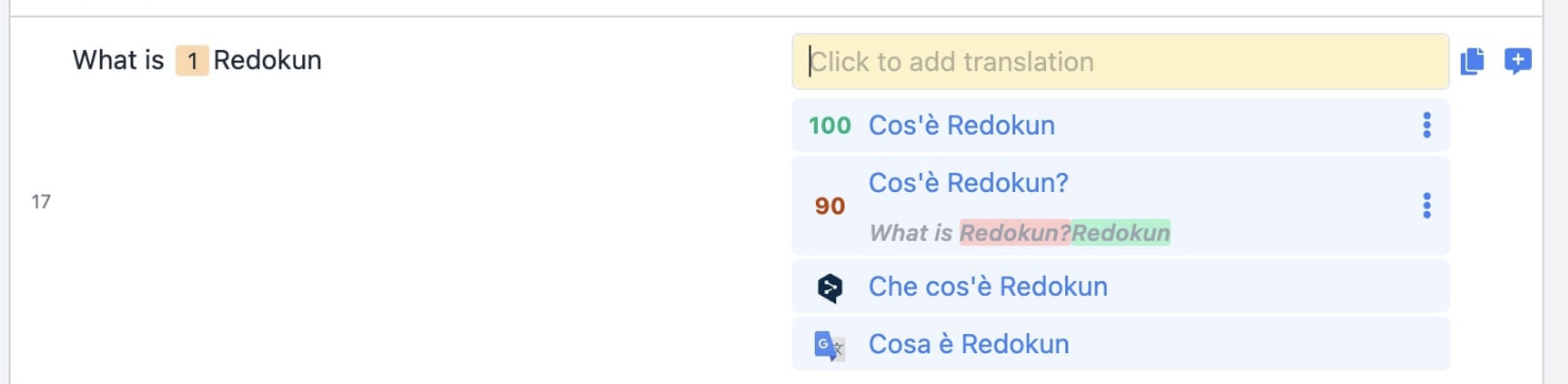 - Machine translation: The Web Editor is equipped with two top machine translation engines, Google Translate and DeepL. Their suggested translation will appear right below the text segment you want to translate next (shown below). Just click to use or edit.